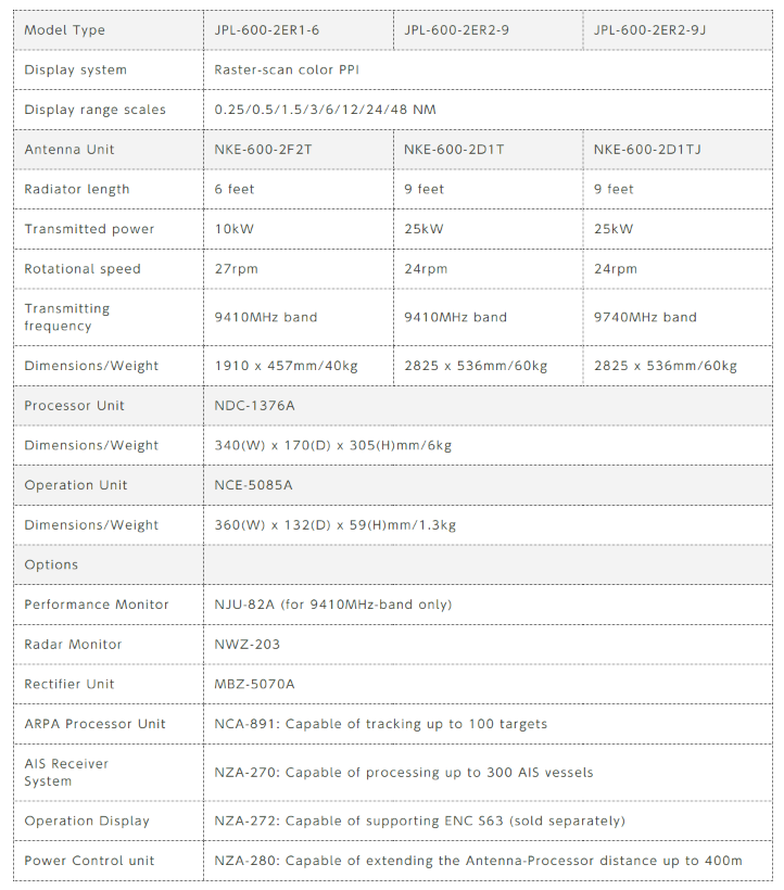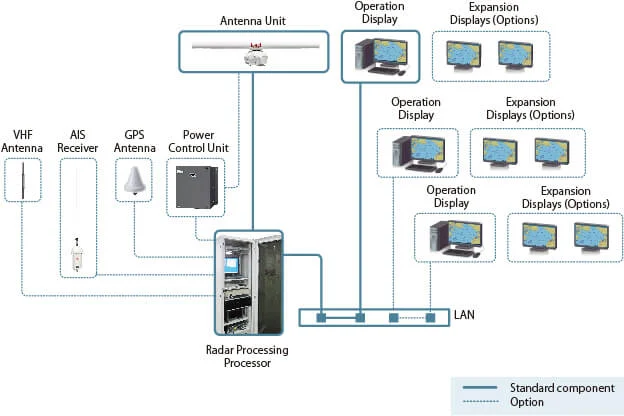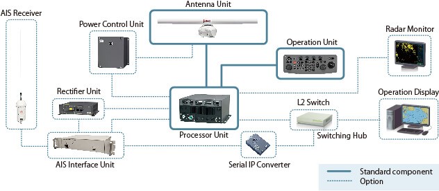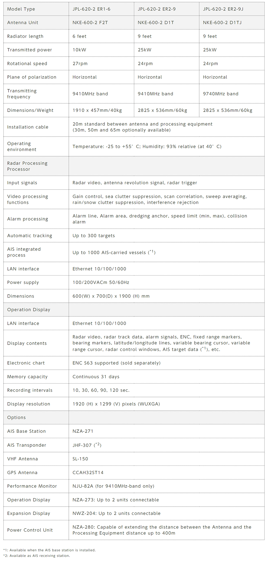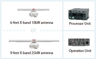 Each radar antenna is selectable from a lineup of 9-foot (2-unit), 9-foot (3-unit), 18-foot (3-unit) horizontal and 18-foot(3-unit) circular types, and the X-band transmitter/ receiver system is available in the conventional magnetron type and the solid-state type, allowing the optimum system configuration to meet the purpose of use and the sea water coverage.