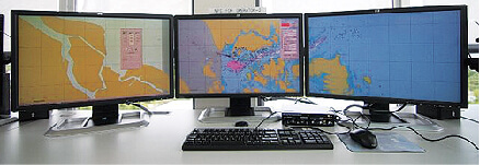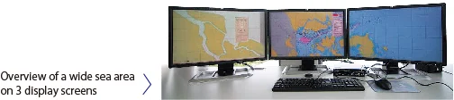 Up to 5 Operation Displays can be installed optionally, allowing two or more VTS operators to monitor sea water areas. By selecting optional displays, up to 3 screens ca n be connected to one Operation Display Unit. The 3 display screens can present 3 different displays individually or one integrated water area as a single screen, allowing flexible screen configuration.