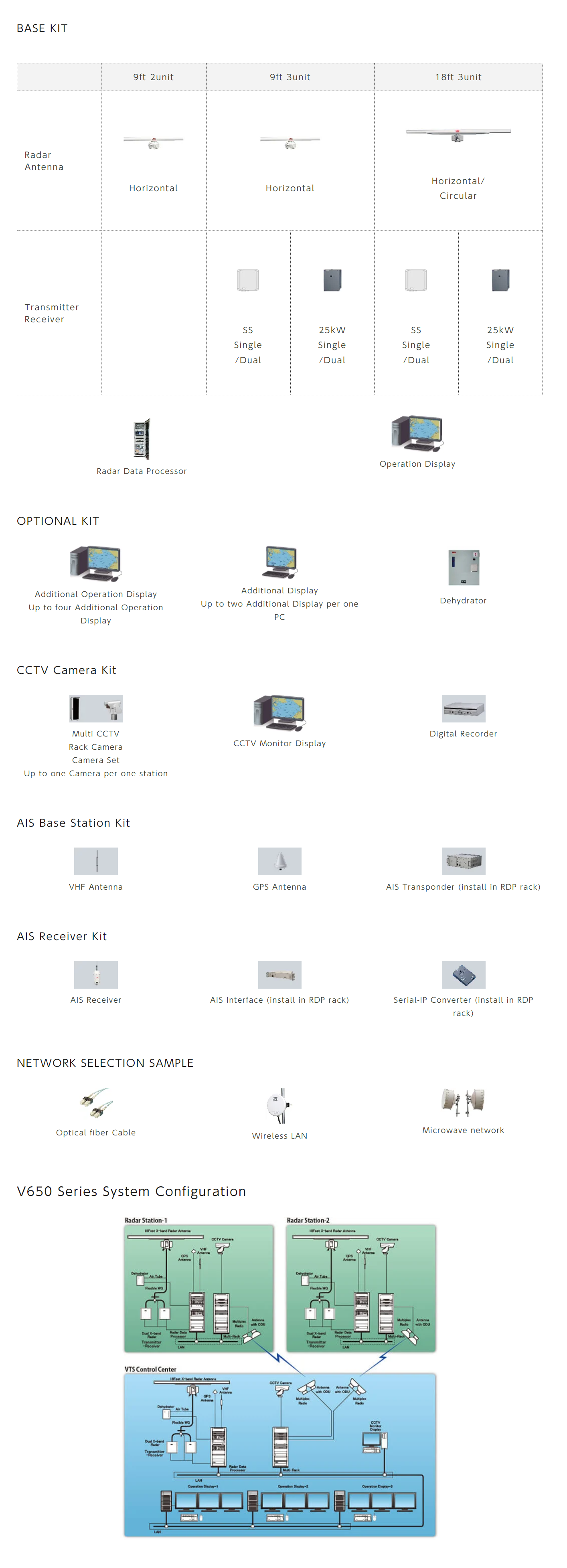 The “TRIHAWK V650 Series” is the JRC standard type of VTS system capable of a medium to large scale of sea area surveillance. This system can integrate the data from 3 radar stations to monitor vessel movements in a wide sea area (100NM). This series can be designed for the Basic and Standard System in accordance with IALA-128.